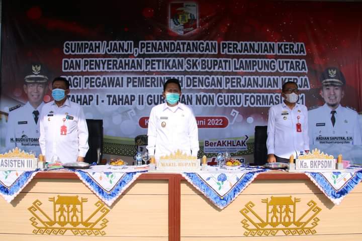 NUSAN. ID, LAMPUNG UTARA – Wakil Bupati Lampung Utara Ardian Saputra, SH., menghadiri upacara penyerahan petikan Surat Keputusan Bupati Lampung utara mengucapkan sumpah janji, penandatangan berita acara Pegawai Pemerintah Perjanjiam Kerja (P3K) tahap 1, tahap 11, guru dan non guru formasi tahun 2021 Lampung Utara sebanyak 891 orang, diberikan secara simbolis pada hari ini Rabu, (22/06/2022) di lapangan stadion Sukung Kotabumi.
