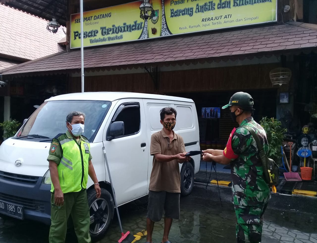 NUSAN.ID, SURAKARTA – Bertempat di Pasar Triwindu jln Diponegoro kelurahan Keprabon kecamatan Banjarsari, Babinsa Kelurahan Keprabon Koramil 02/Banjarsari Kodim 0735/Surakarta Serka Daniel dan Serda Sugiyanto melaksanakan kegiatan himbauan protokol kesehatan (Prokes) dan bagi – bagi masker gratis, Selasa (02/08/2022).