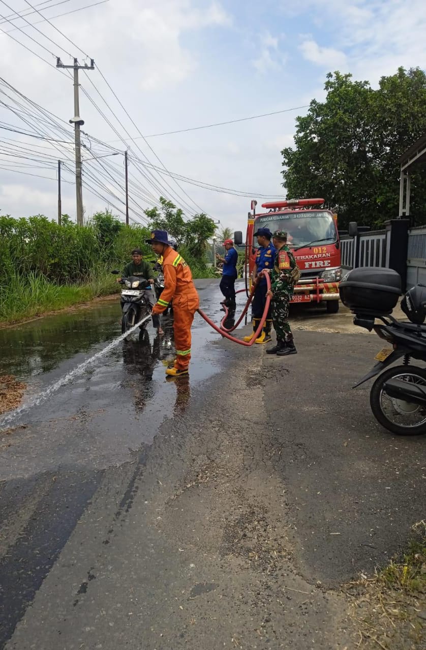 Kegiatan pembersihan ini merupakan tindakan cepat yang diambil setelah Babinsa menerima informasi dari warga sekitar mengenai adanya cairan yang menyebar di permukaan jalan raya. Setelah melakukan pemeriksaan langsung ke lokasi, diketahui bahwa cairan yang tumpah adalah solar yang berasal dari mobil tangki BBM yang sedang dalam perjalanan dan mengalami kebocoran pada bagian bawah kendaraannya saat melintas di kawasan tersebut. Solar yang tumpah tidak hanya menggenang di satu titik, namun juga mengalir sepanjang jalan raya hingga mencapai panjang ±100 meter, mencakup dua jalur lalu lintas yang sering digunakan oleh masyarakat untuk beraktivitas.