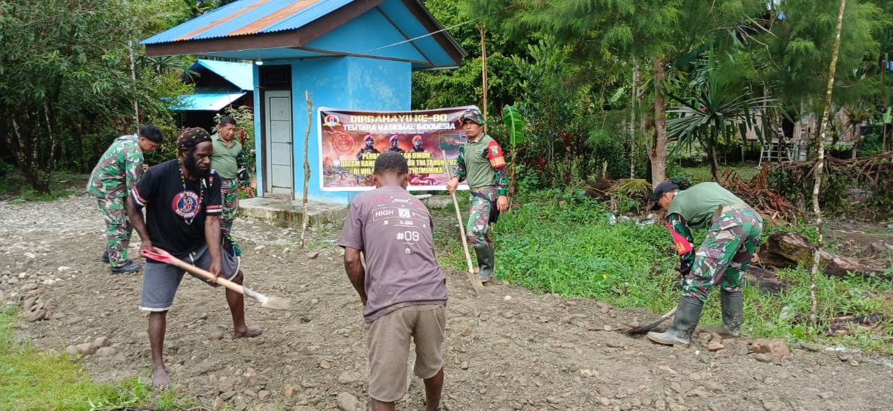 NUSAN.ID- Wujud Bakti nyata sebagai satuan kewilayahan menjelang peringatan HUT ke-80 TNI tahun 2025, Kodim 1710/Mimika menyelenggarakan kegiatan Karya Bakti Perbaikan fasilitas umum berupa Jalan masuk menuju Kp. Jimbi, Distrik Kuala Kencana, Kabupaten Mimika, Kamis (25/09/2025).