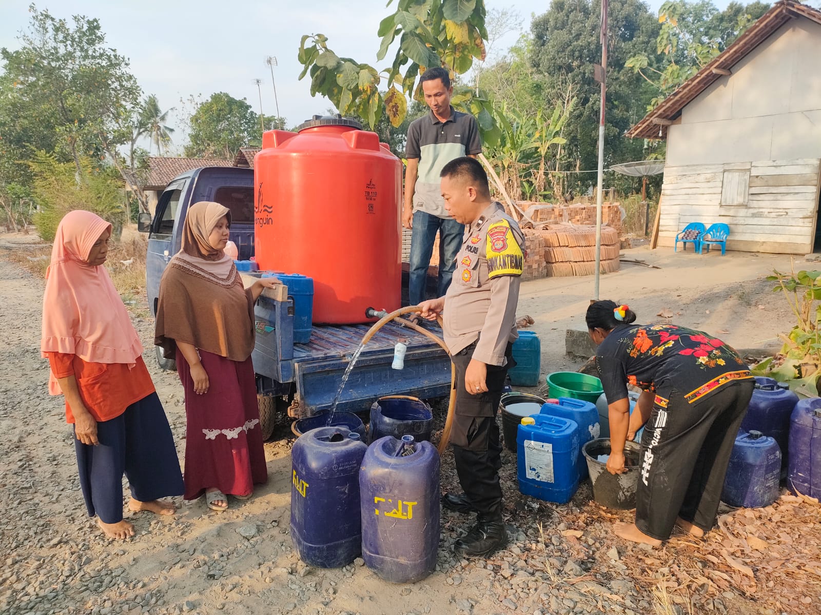 NUSAN.ID, TULANG BAWANG BARAT – Bhabinkamtibmas Polsek Tulang Bawang Tengah (TBT), Polres Tulang Bawang Barat Aipda Kirman dan aparatur tiyuh Penumangan Baru menyalurkan bantuan air bersih di daerah yang dilanda kekeringan tepatnya di Desa/Tiyuh Penumangan Baru, Kecamatan Tulang Bawang Tengah, Kabupaten Tulang Bawang Barat pada hari minggu (15/10/2023).