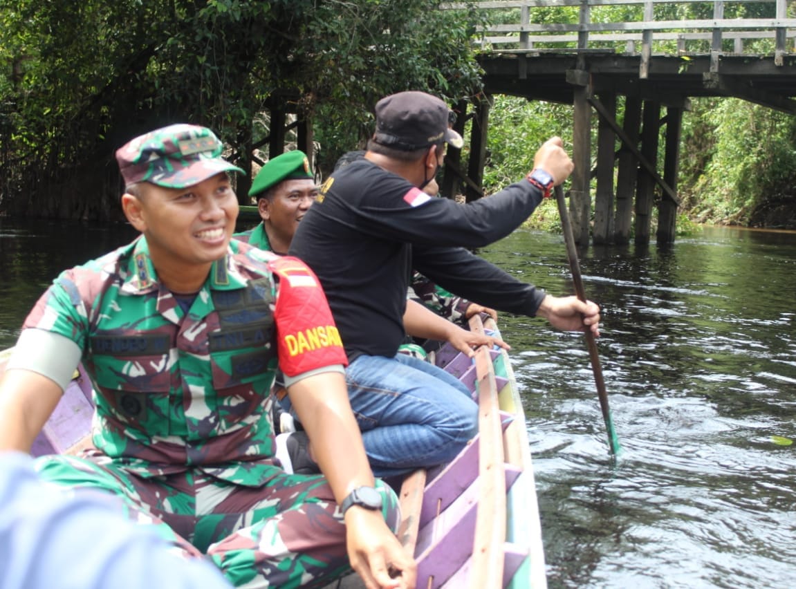 Pantauan di lapangan, perangkat desa setempat dan Dandim 1012/Buntok yang berseragam lengkap nekat menyusuri sungai dengan panjang kurang lebih 1 km menggunakan perahu.