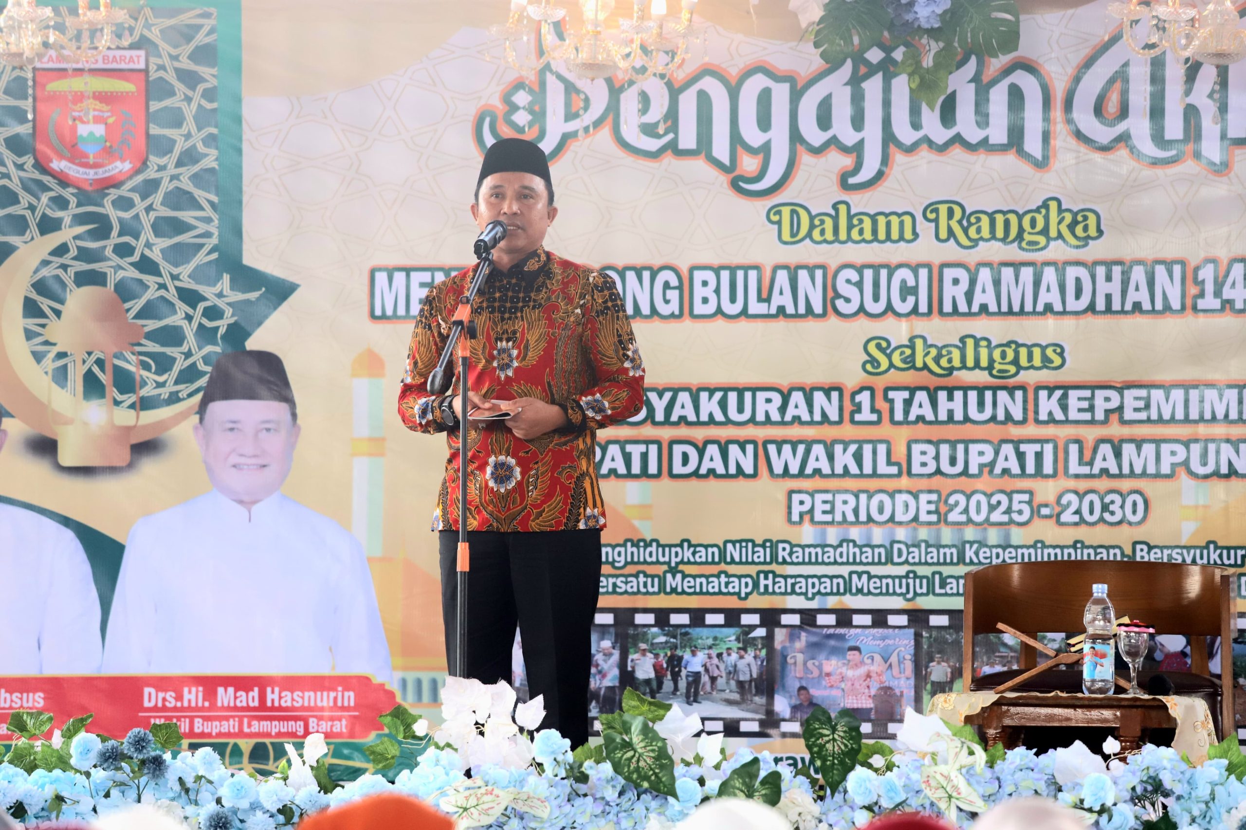 Di tengah lantunan doa dan tausiyah, Bupati Parosil Mabsus menyampaikan ucapan selamat menunaikan ibadah puasa Ramadhan 1447 Hijriyah kepada seluruh masyarakat Lampung Barat.