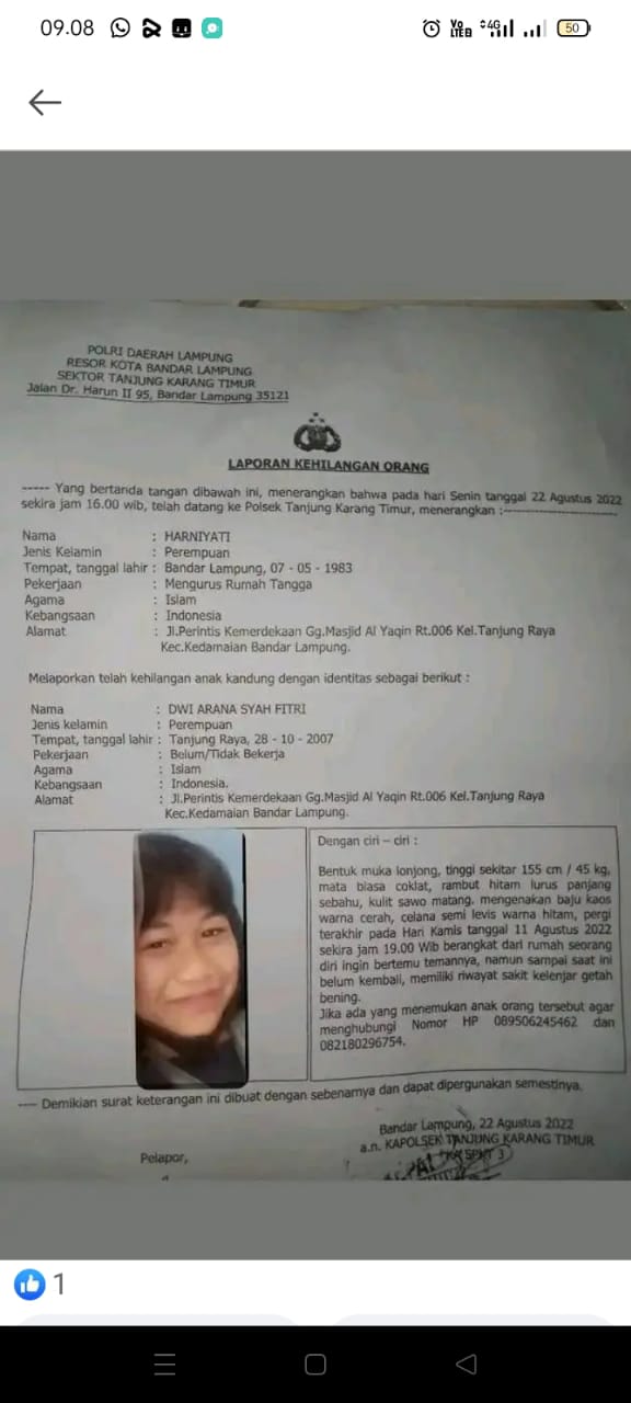 Kemudian ,mata blasa coklat, rambut hitam lurus panjang sebahu, kulit sawo matang. mengenakan baju kaos warna cerah, celana semi levis warna hitam , memiliki riwayat sakit kelenjar getah bening dan pergi terakhir pada Hari Kamis tanggal 11 Agustus 2022 sekira jam 19.00 Wib berangkat dari rumah seorang