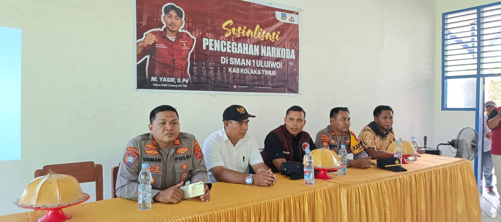 NUSAN.ID – Polres Kolaka Timur melalui Satuan Reserse Narkoba (Satresnarkoba) dan Seksi Binmas bersama dengan Polsek Uluiwoi bersama HAM, menggelar kegiatan sosialisasi Judulnya giat sosialisasi pencegahan narkoba di Kolaka Timur, Pemberantasan, Penyalahgunaan dan Peredaran Gelap Narkoba (P4GN) di SMA 1 Uluiwoi, Kecamatan Uluiwoi, Kabupaten Kolaka Timur.