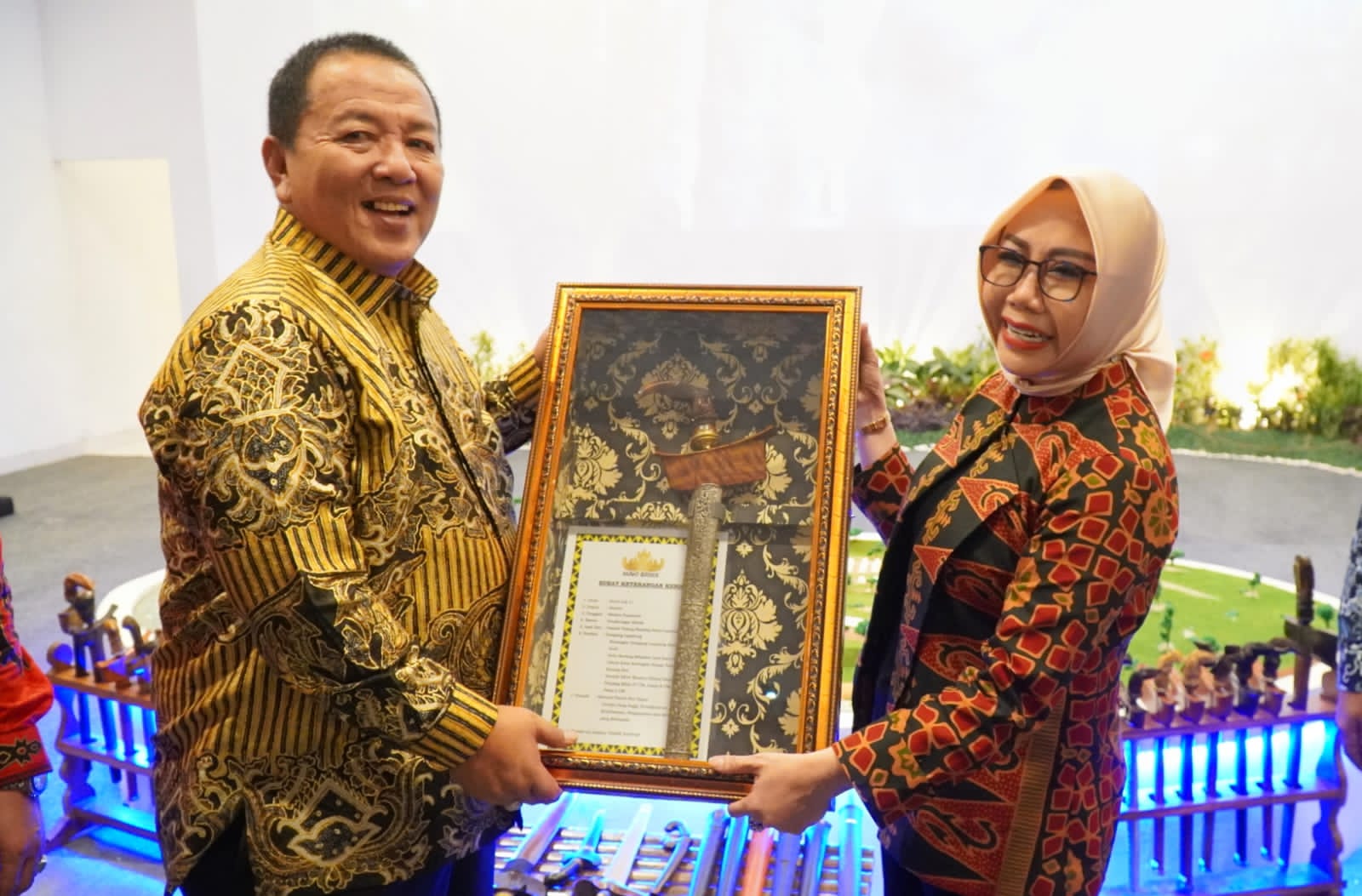Arinal Djunaidi yang disambut Penjabat Bupati Tubaba Zaidirina, Sekretaris Daerah Tubaba Novriwan Jaya, Ketua DPRD Tubaba Ponco Nugroho, Ketua Dharma Wanita Novi Novriwan Jaya, dan para Pejabat Tinggi Pratama Pemkab Tubaba mendapat kalungan kain tapis lampung dari Muli Mekhanai Tubaba di Pintu Gerbang Anjungan.