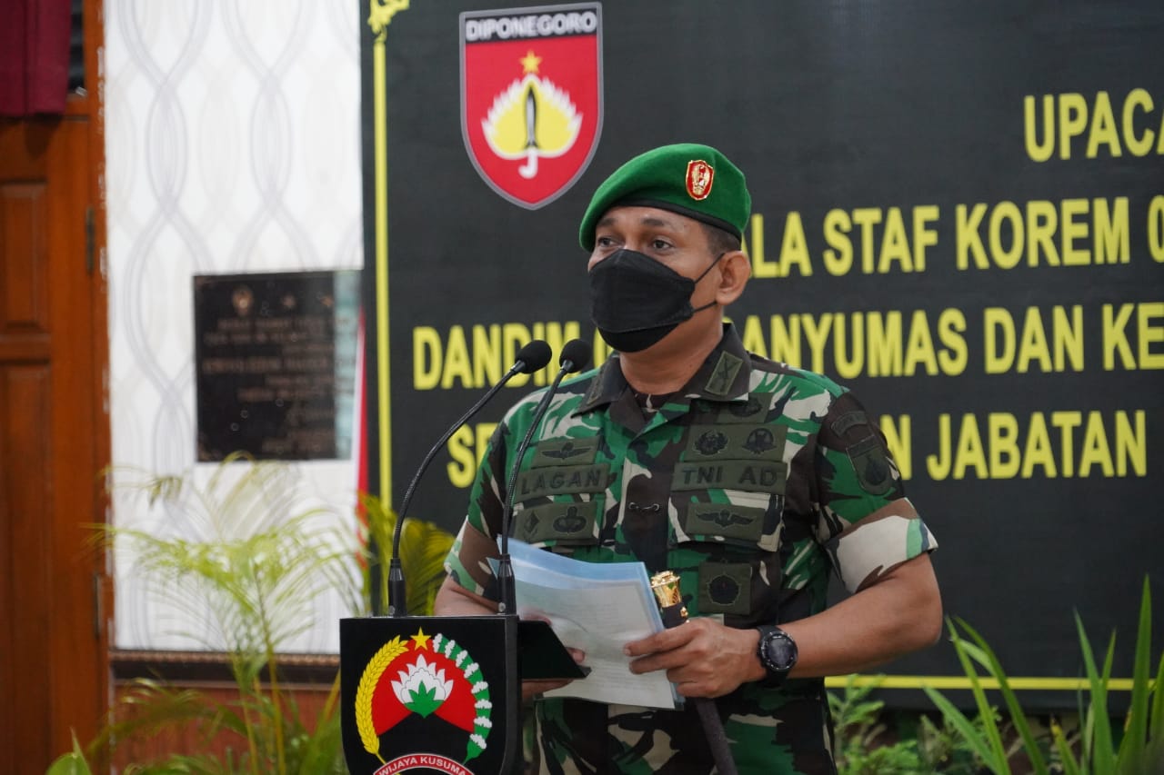 NUSAN.ID, BANYUMAS – Komandan Korem 071/Wijayakusuma, Kolonel Inf Dwi Lagan Safrudin, S.I.P., pimpin rotasi jabatan Perwira Menengah Korem 071/Wijayakusuma guna mengisi kekosongan pejabat dilingkungan Korem 071/Wijayakusuma, Rabu (19/01/2022) di Aula Jenderal Sudirman Makorem 071/Wijayakusuma, Sokaraja, Banyumas.