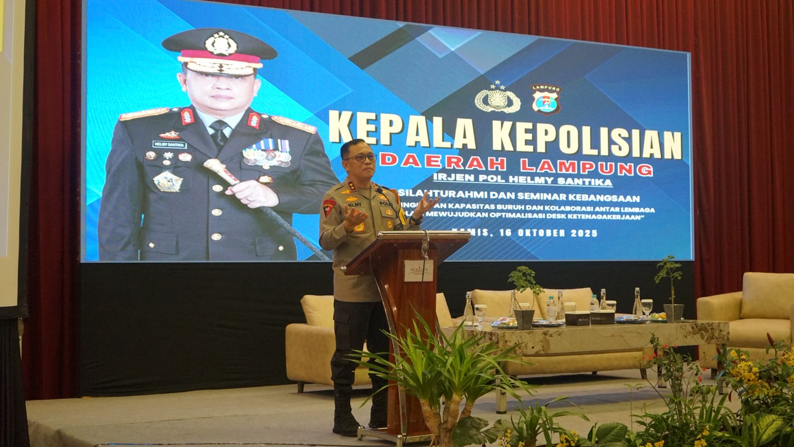 NUSAN.ID – Kapolda Lampung Irjen Pol. Helmy Santika menghadiri undangan Silaturahmi dan Seminar Kebangsaan yang digelar oleh Perserikatan Buruh Provinsi Lampung, bertempat di Hotel Horison Bandar Lampung. Kamis(16/10/25).