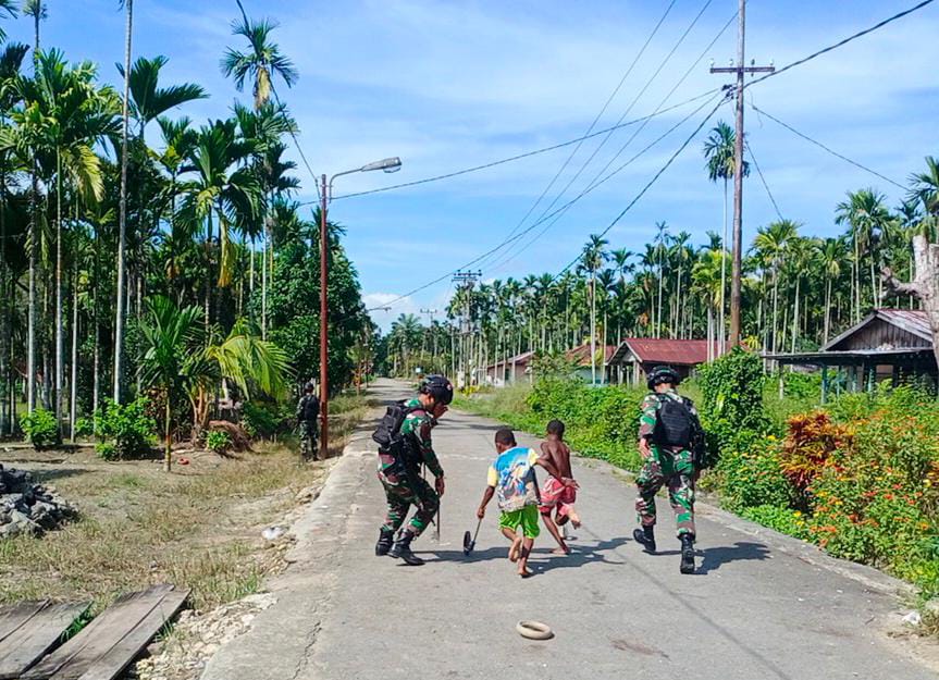 ‘Terlihat Prajurit TNI dan anak-anak bermain bersama untuk menjalin kedekatan, kebersamaan dan keakraban antara TNI dengan anak-anak dan warga di Kampung Arso.