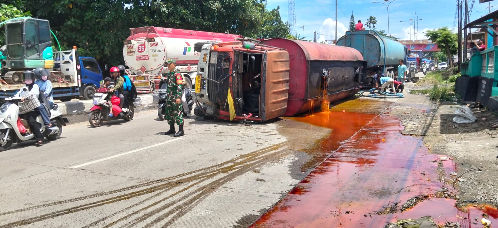 NUSAN.ID – Kecepatan dan ke tanggapan seorang Babinsa dalam menangani musibah di wilayah binaannya kembali ditunjukkan oleh Koptu Romy, Babinsa Kelurahan Rajabasa Raya, Koramil 410-06/KDT. Saat terjadi kecelakaan truk bermuatan minyak sawit yang terguling di Jalan Bypass Raya, Sabtu pagi (11/4/2026), Koptu Romy langsung bergerak cepat ke lokasi kejadian.