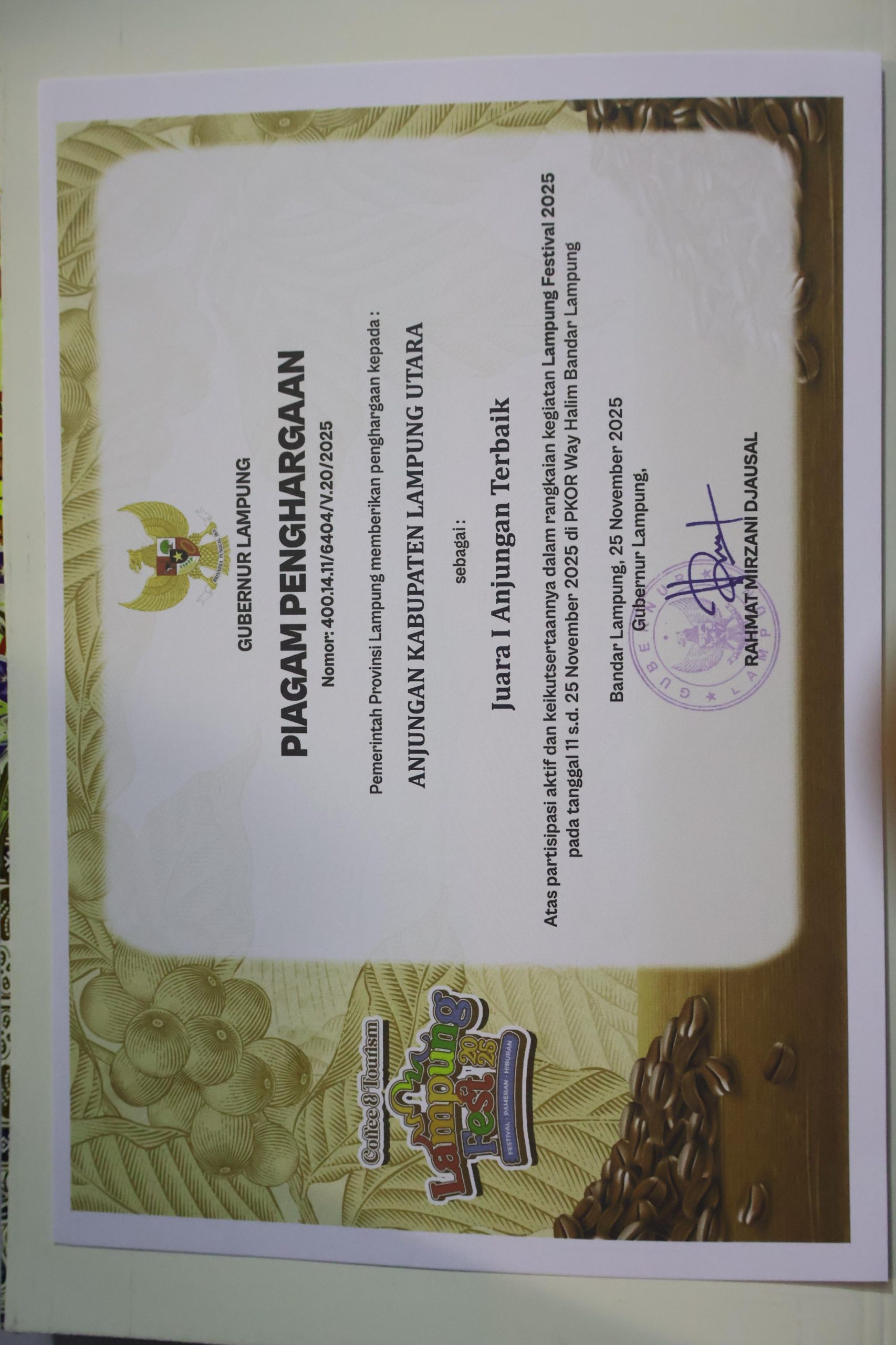 Penghargaan tersebut dituangkan dalam Piagam Penghargaan Gubernur Lampung Nomor: 400.14.11/6404/V.20/2025, yang ditandatangani oleh Gubernur Lampung Rahmat Mirzani Djausal. Piagam ini diberikan sebagai bentuk apresiasi atas partisipasi aktif, kontribusi, dan kreativitas Anjungan Lampung Utara dalam mendukung kesuksesan Lampung Fest 2025.