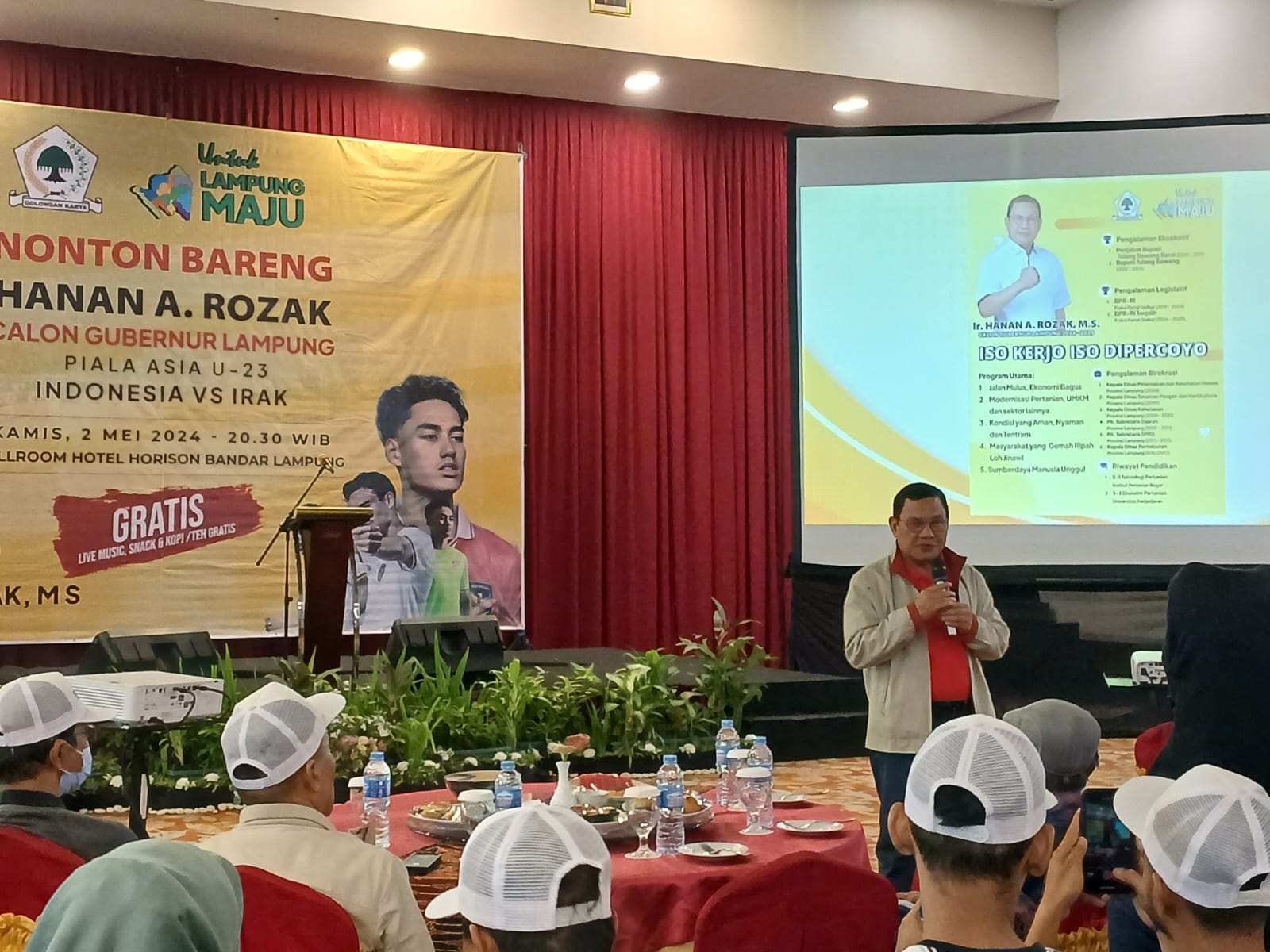 NUSAN.ID, KOTA BANDAR LAMPUNG – Bakal Calon Gubernur (Bacagub) Lampung, Ir. H. Hanan A Rozak MS menggelar acara nonton bareng (Nobar) gratis juara 3 (tiga) terbaik se-Asia antara tim Nasional Indonesia VS Tim Irak bertempat di Ballroom Hotel Horison, Bandar Lampung yang dihadiri oleh ribuan Warga pada Kamis (02/05/2024).