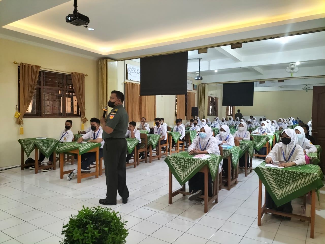 NUSAN.ID, SURAKARTA – Perwira Seksi Teritorial (Pasiter) Kodim 0735/Surakarta Kapten Coba Kurdi didampingi Babinsa Kelurahan Pajang Serma Puri dan Serda Tonny H memberikan materi wawasan kebangsaan dan bela negara kepada 49 siswa pelajar SMK muhamadiyah 4 Surakarta di aula SMK muhamadiyah 4 Surakarta Kelurahan Pajang, Kecamatan Laweyan, Rabu (13/07/2022).