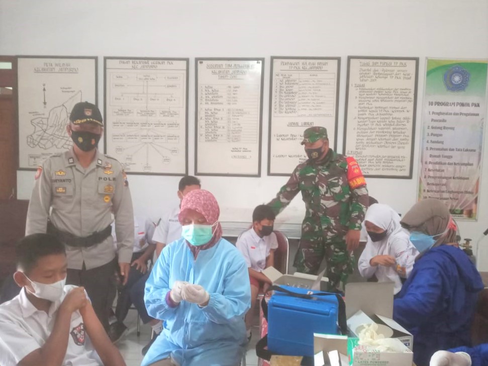 NUSAN.ID, WONOGIRI – Bintara Pembina Desa (Babinsa) Koramil 15/Jatipurno Kodim 0728/Wonogiri Pelda Wagiyo mendampingi petugas kesehatan melaksanakan vaksinasi dosis I dan II bertempat di Pendopo Kecamatan Jatipurno Kabupaten Wonogiri, Rabu (27/10/2021).