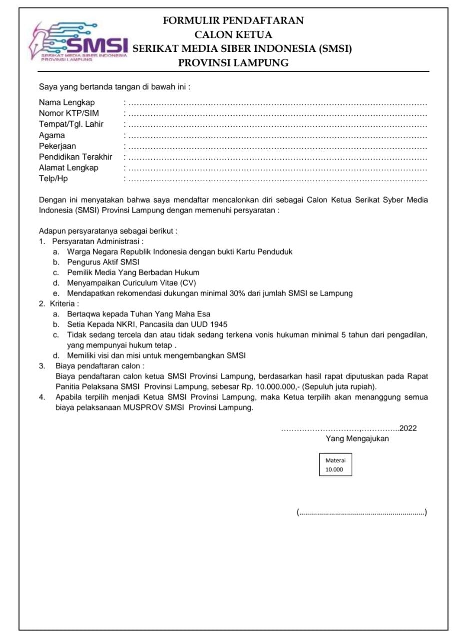 NUSAN.ID, BANDAR LAMPUNG – Serikat Media Siber Indonesia (SMSI) Lampung, membuka pendaftaran bakal calon ketua Pengurus Provinsi Lampung.
