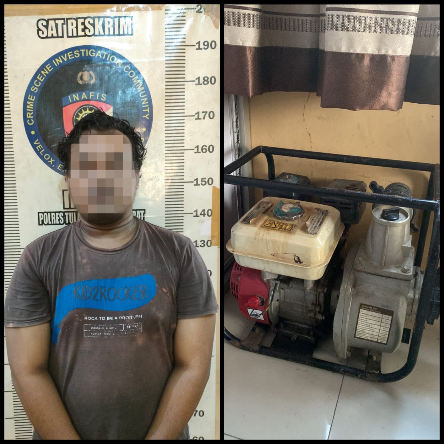 NUSAN.ID, TULANG BAWANG BARAT – Team Tekab 308 Presisi Sat Reskrim Polres Tulang Bawang Barat berhasil mengamankan seorang pemuda berinisial MT (28) yang merupakan warga tiyuh Pulung Kencana Kecamatan Tulang Bawang Tengah, yang diduga sebagai pelaku kasus pencurian mesin alkon (mesin pompa air) di tiyuh candra kencana kecamatan Tulang Bawang Tengah Kabupaten Tulang Bawang Barat.