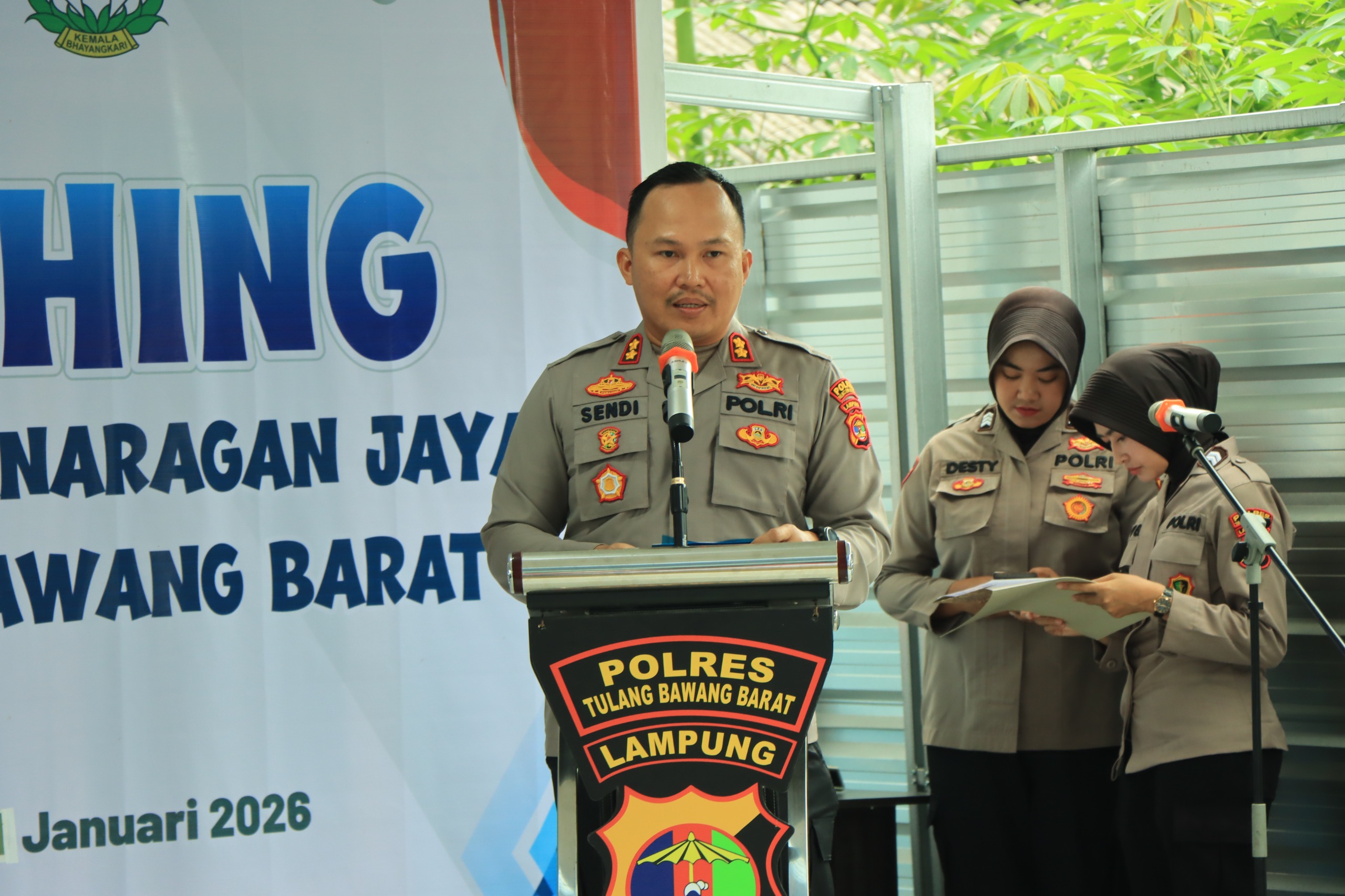 NUSAN.ID – Kapolres Tulang Bawang Barat AKBP Sendi Antoni, S.I.K, M.IK., bersama Ketua Bhayangkari Cabang Ny. Nina Sendi Antoni, memimpin langsung kegiatan Launching Satuan Pelayanan Pemenuhan Gizi (SPPG) Polres Tulang Bawang Barat (Tubaba), Polda Lampung yang berlokasi di Kelurahan Panaragan Jaya, Kecamatan Tulang Bawang Tengah, Kabupaten Tulang Bawang Barat, Rabu (21/01/2026).