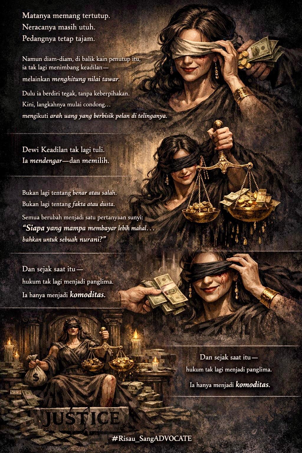 “Matanya memang tertutup, neracanya masih utuh, pedangnya tetap tajam… namun di balik kain penutup itu, ia mulai menghitung keuntungan,” ucap Alfan Sari dalam sebuah pernyataan yang kemudian dibagikan melalui berbagai platform.
