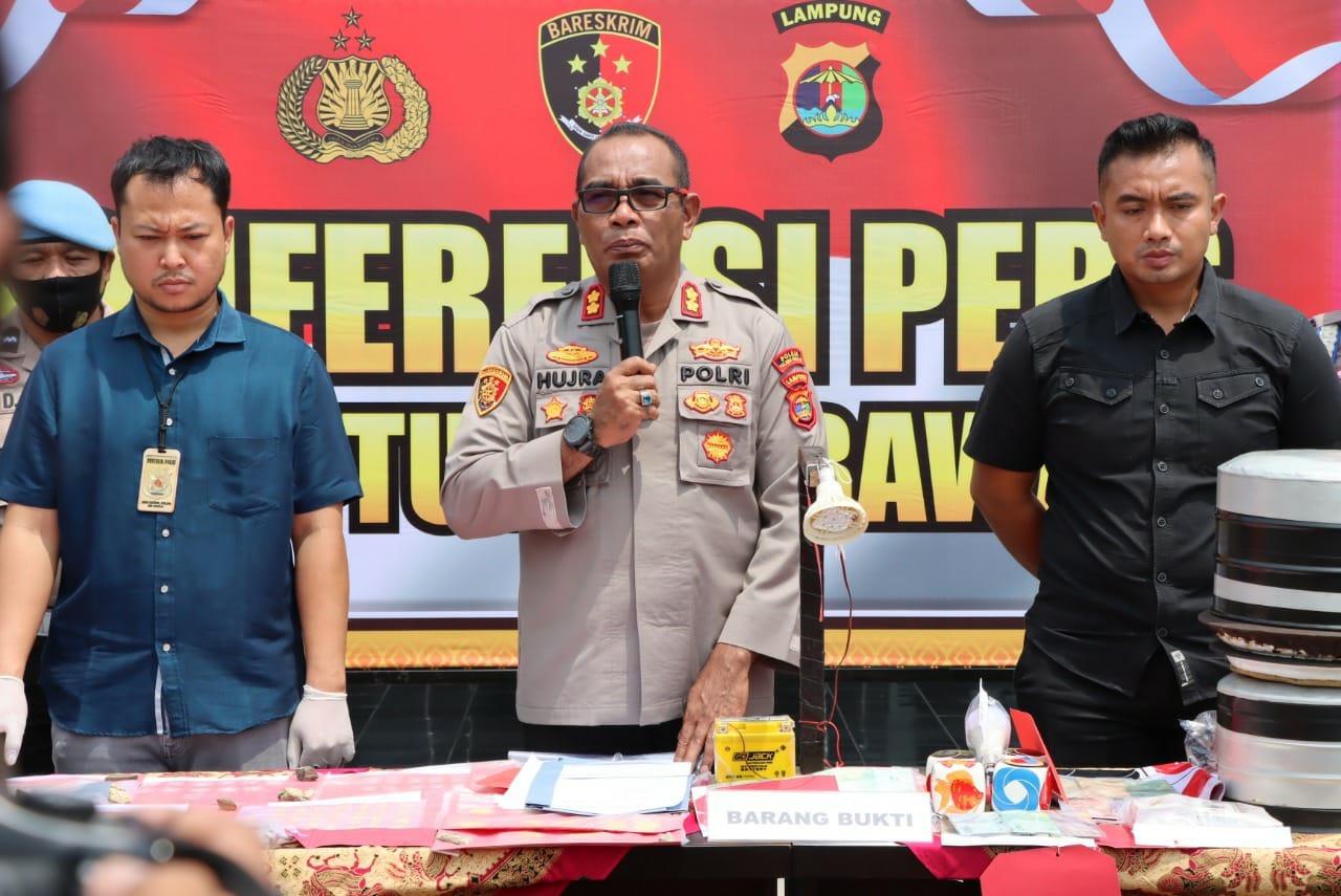 “Selama tiga bulan, dari 01 Juni s/d 25 Agustus 2022, petugas kami berhasil mengungkap 27 kasus dengan pelaku sebanyak 34 orang,” kata Kapolres Tulang Bawang, AKBP Hujra Soumena, SIK, MH, didampingi Kasatres Narkoba, AKP Aris Satrio Sujatmiko, SIK, MH, Kasat Reskrim, AKP Wido Dwi Arifiya Zaen, SIK, MH, KBO Satreskrim, Iptu Abdullah, dan KBO Satresnarkoba, Ipda Sigit Yudha Asmara, saat menggelar konferensi pers, hari Kamis (25/08/2022), pukul 11.30 WIB, di halaman Mapolres setempat.