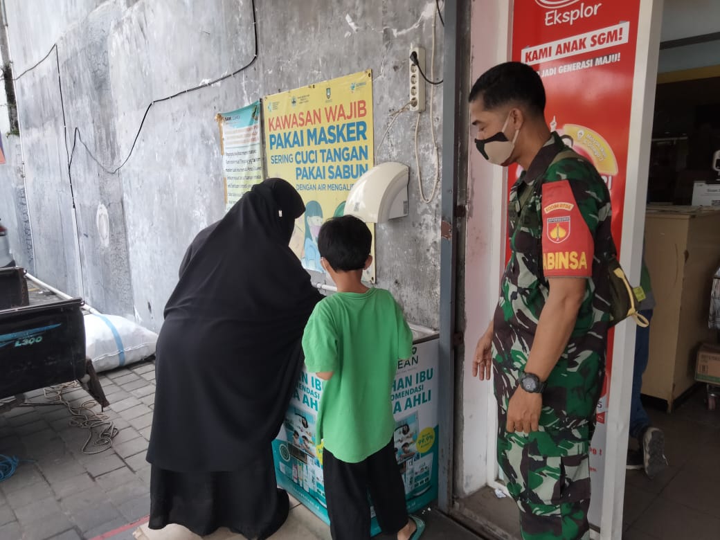 Babinsa Kelurahan Sriwedari Koramil 01/ Laweyan Kodim 0735/Surakarta Sertu Widodo dan Kopka Subiyanto melaksanakan kegiatan Penerapan Pemberlakuan Pembatasan Kegiatan Masyarakat (PPKM) level 3 serta pembagian masker dalam rangka penanganan Virus Pendemi Covid -19 di Pasar Modern Sami Luwes Jln Honggowongso Kelurahan Sriwedari Kecamatan Laweyan, Minggu (13/03/2022)