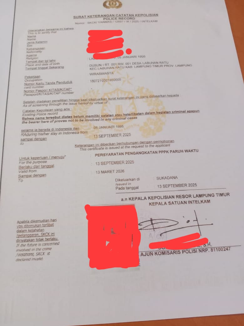 Penerbitan Salah Satu SKCK di Polres Lampung Timur untuk Persyaratan PPPK PW Formasi 2025 Diduga Melanggar Prosedur Standar