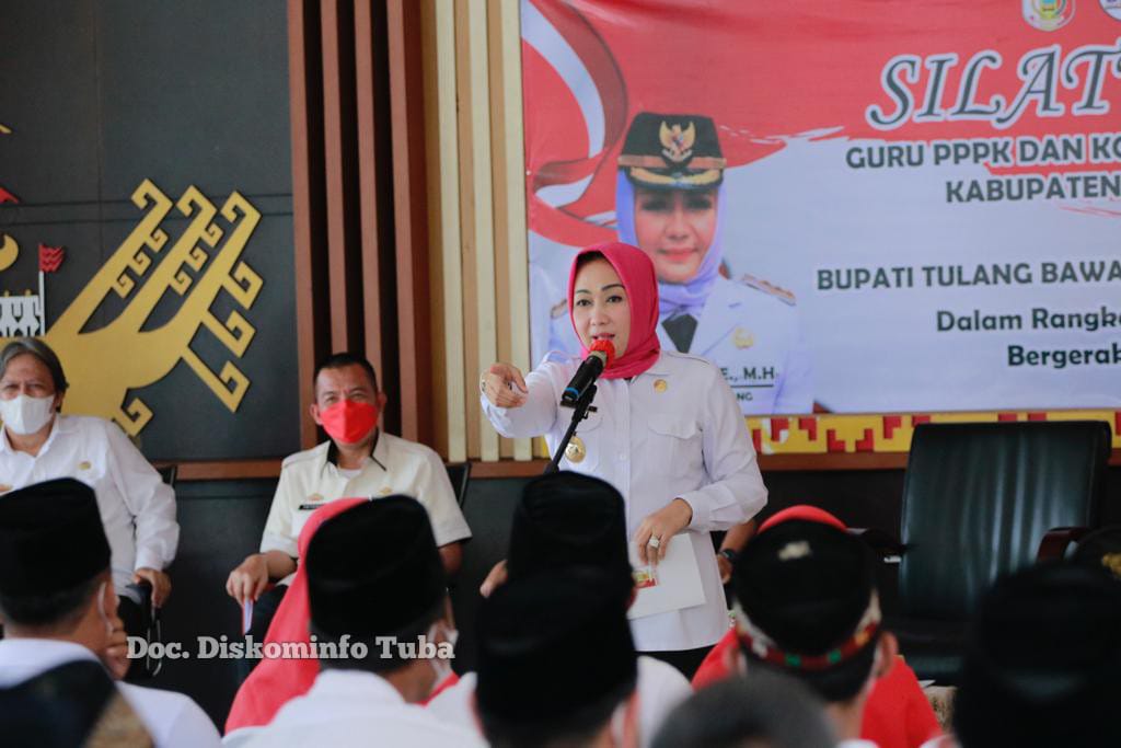 NUSAN.ID, TULANG BAWANG – Dalam rangka mendukung kesuksesan 25 program bergerak melayani warga (BMW) Kabupaten Tulang bawang, Bupati Tulang Bawang ibu Dr Hj Winarti SE MH menggelar acara silaturahmi dengan Guru PPPK dan Koordinator Bidan desa se Kabupaten Tulang Bawang yang di laksanakan di pendopo rumah dinas jabatan Bupati Tulang Bawang Rabu (22/06/2022).
